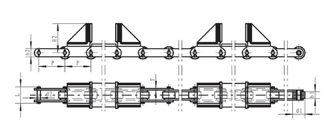 | Pitch P (mm) | Inner width of inner link b1 (mm) | Diameter of roller d1 (mm) | Diameter of pin d2 (mm) | Length of pin L (mm) | Height of sidebar h2 (mm) | Thickness of sidebar T (mm) | Width of attached plate H2 (mm) | Tensile strength Q (KN) |